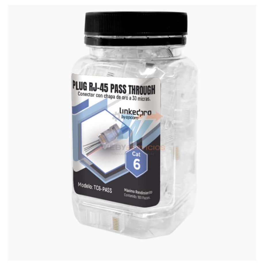 Bote con 100 Plugs PASSTHROUGH Linkedpro RJ45 Cat6 sin blindaje, chapado de oro a 30 micras para durabilidad. TC6-PASS