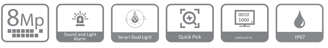 - Alarma y audio: 1 entrada y 1 salida para alarma; 1 entrada y 1 salida para audio. Soporta tarjeta Micro SD de hasta 256 GB. Incluye micrófono dual y altavoz incorporado, con capacidad para conversación bidireccional.