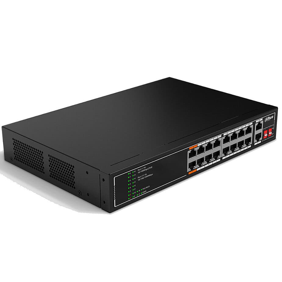 Este es un switch DAHUA SF1018LP es un Switch PoE de 18 Puertos de los cuales 16 te suministra hasta 135 Watts Totales. Los 16 Puertos PoE son de velocidad 10/100 y cuentas con 2 Puertos adicionales para uplink 10/100/1000 con Switching 7.2 Gbps. Es compatible con Standares: IEEE802.3af; IEEE802.3at; Hi-PoE y soporta funcionalidad PoE extendido hasta 250 Metros.