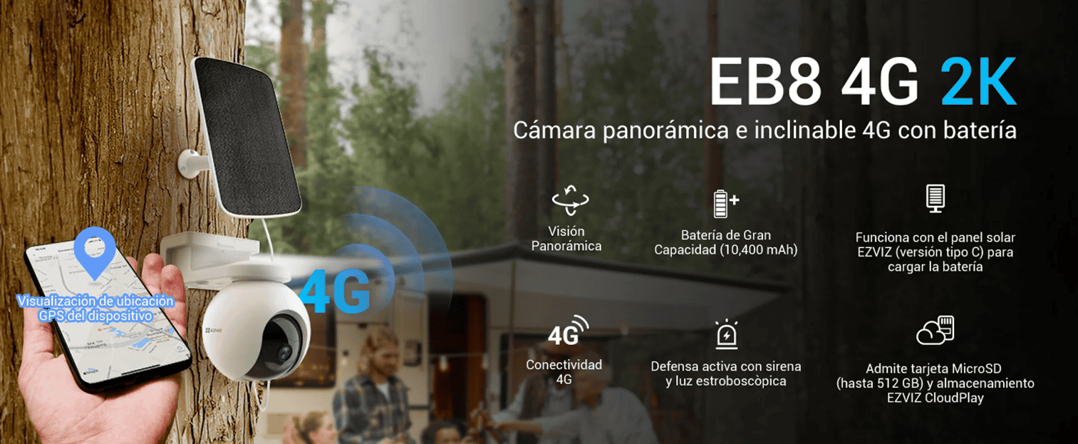 La cámara Ezviz Solar 4G es una cámara de Batería Recargable compatibles con sim 4G de datos para poder tener visualización remota. Para que esta cámara funcione autónoma hay que añadir el panel solar CS-CMT-SOLARPANEL-E de conector Tipo C.