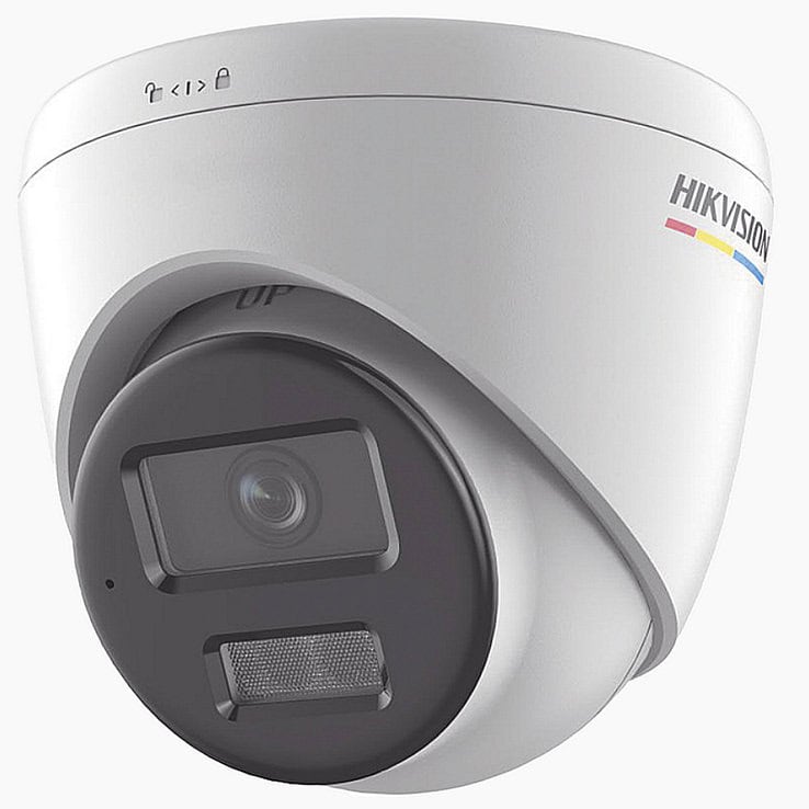 La cámara turret DS-2CD1347G2H-LIUF de Hikvision es un tipo de cámara ip con función COLORVU de tecnología Dual Light lo cual nos permite iluminación o infrarrojo según sea requerido. Esta cámara domo Turret IP tiene calidad de 4 Megapixeles y cuenta con un lente de 2.8 mm. En el apartado de iluminación encontraremos un ir de hasta 30 mts y luz cálida/blanca de hasta 30 mts. Esta cámara es serie 1 e integra micrófono e inteligencia ACUSENSE Lite. La cámara Hikvisión está diseñada para ser instalada incluso en exterior por su certificación IP67 y cuenta con WDR 120 dB, su alimentación es por PoE y puede guardar información internamente en Micro SD de hasta 512GB.