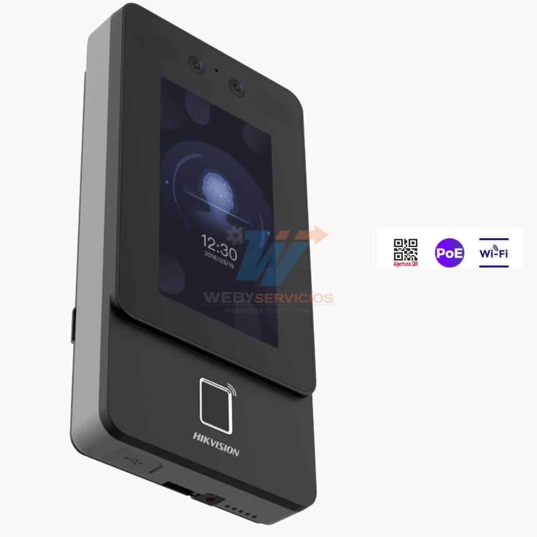 La Terminal Min Moe PoE & WiFi DS-K1T342MFWX-E1 de Hikvision, es un control de Reconocimiento Facial y Huella con Lector MIFARE, puede funcionar en exterior con certificación IP65 y puede hacer una lectura de rostro hasta 1.5 mts , Soporta P2P, 1,500 Rostros, 3,000 Huellas y cuenta con salida 12 Vcd para Chapa así como alimentación PoE
