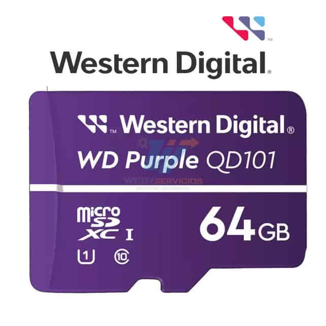 Memoria micros SD WESTERN Digital modelo WDD064G1P0C es una memoria de 64GB Micro SDXC de Línea Purple con velocidad de lectura Clase 10 U1 la cual garantiza Lectura 50MB y Escritura 40MB. Este tipo de memorias están diseñadas especializada para Videovigilancia pero puedes ser utilizada también en smartphone o tabletas.