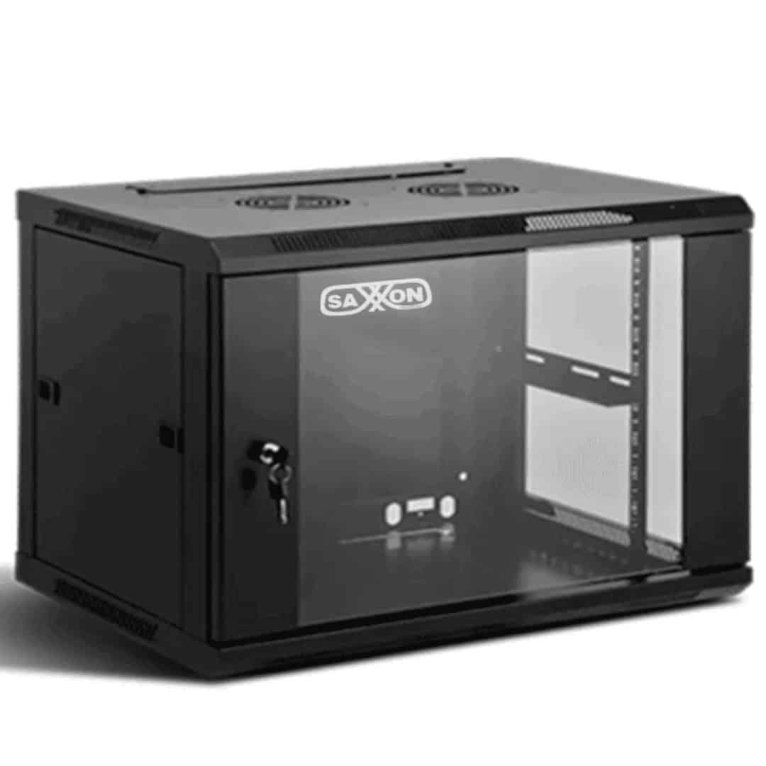 Este gabinete de pared marca SAXXON modelo SXR6U6406S es un Gabinete de Pared en color Negro con espacio para 6UR (6 unidades) con Puerta de Vidrio Templado con dimensiones Alto 37 cm, Ancho 60 cm y Profundidad 45 cm.